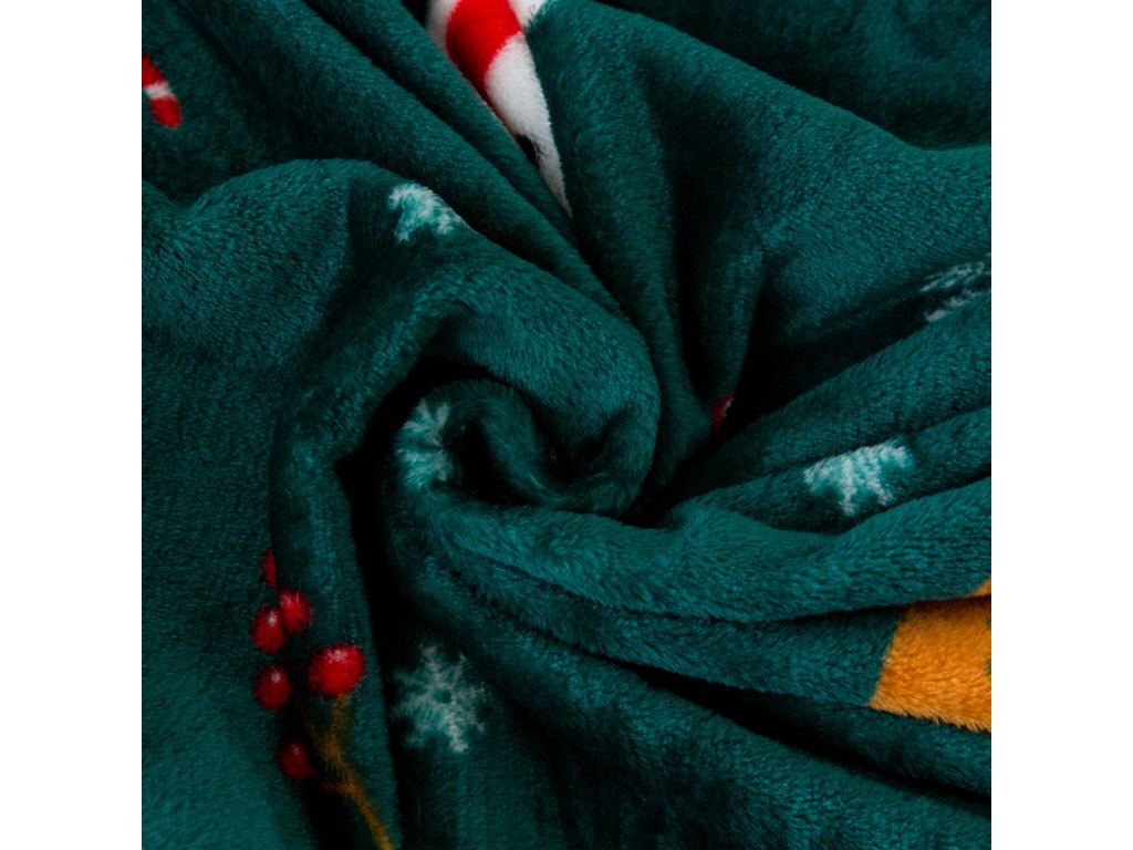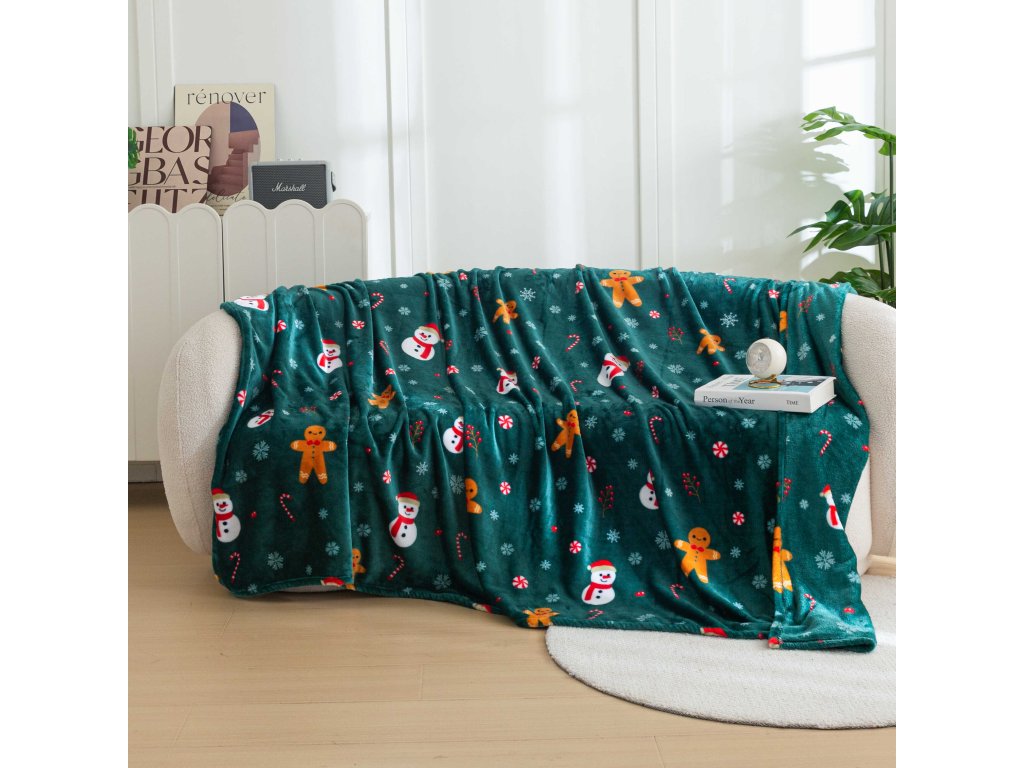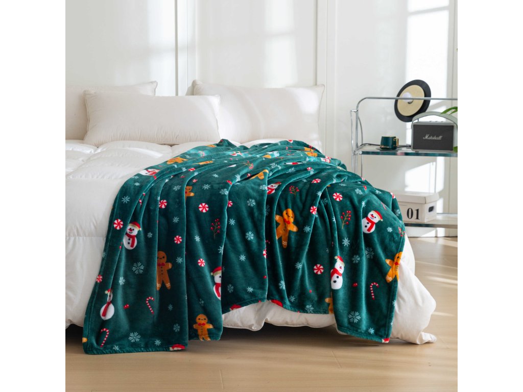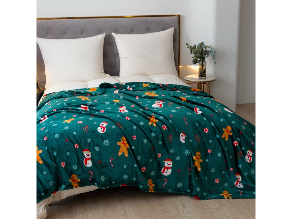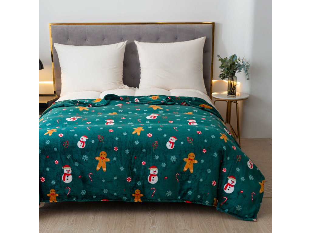 Božićni mikropliš pokrivač SNOWMAN AND GINGERBREAD zelena