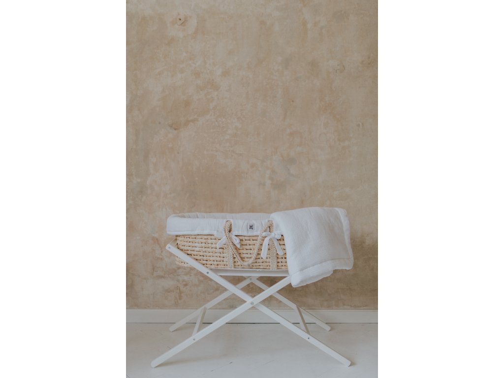 Set uključuje: Mosesovu košaru, madrac, stalak, muslin tekstil s punjenjem koji se sastoji od plahte, deke i jastuka s mjestom za glavu
