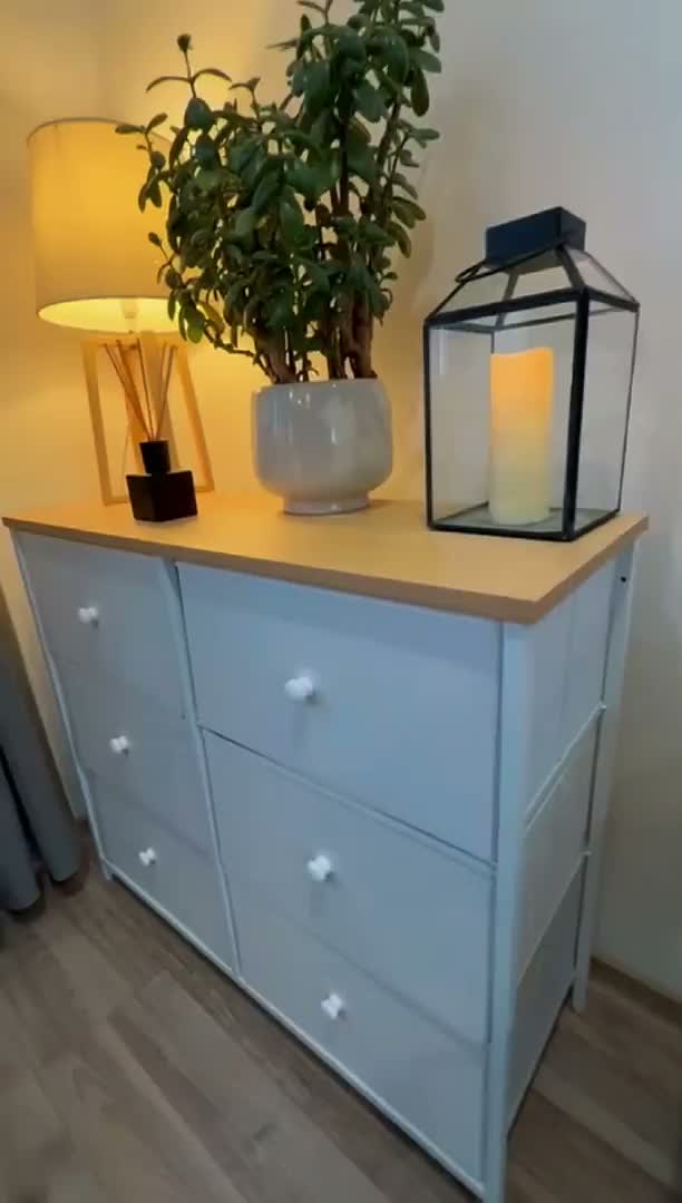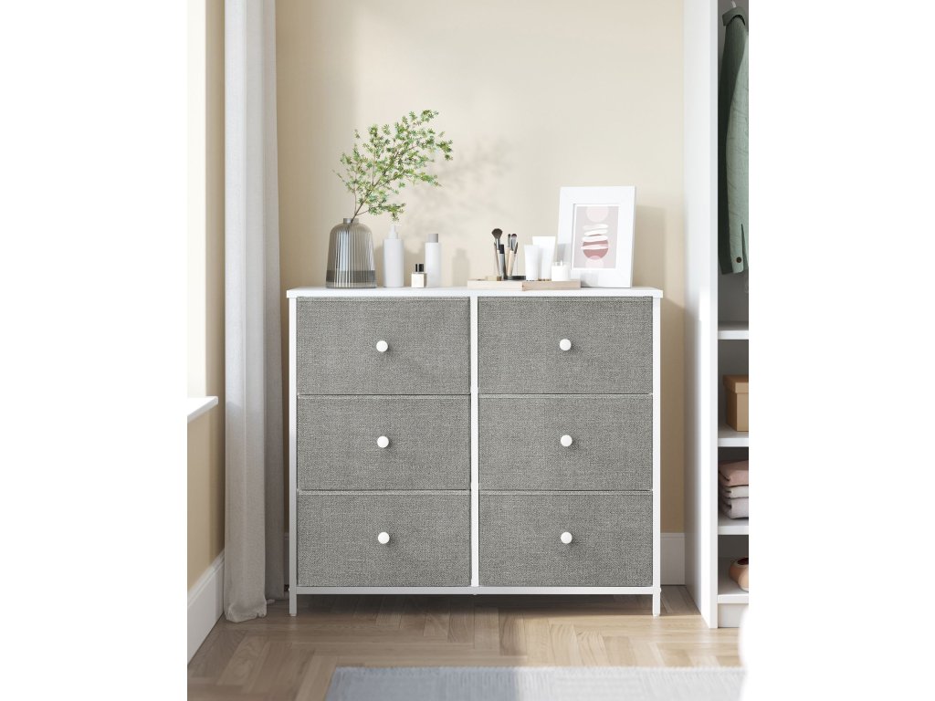 Ova stilizirana komoda u kombinaciji sive tkanine i bijele konstrukcije idealno je rješenje za svakodnevnu organizaciju. Bilo da je postavite u spavaću sobu za donje rublje, u predsoblje za dodatke ili u dječju sobu za igračke, uvijek će ponuditi dovoljno prostora zahvaljujući 6 prostranih ladica. Zbog svoje lagane konstrukcije lako se premješta, a ipak ostaje stabilna zahvaljujući ojačanjima i mogućnosti pričvršćivanja na zid. Elegantni izgled i praktična upotreba čine je idealnim izborom za svaki dom.