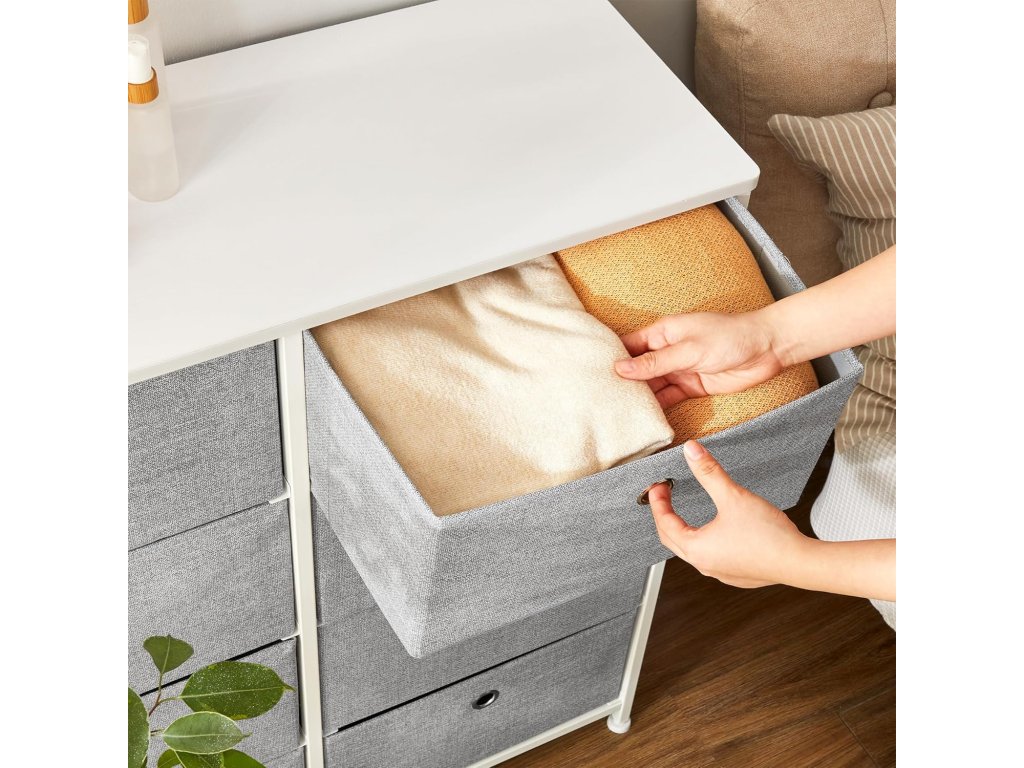 Komoda s tekstilnim ladicama idealno je rješenje za sve koji traže kombinaciju funkcionalnosti i estetike. Laka je, jednostavna za premještanje i iznenađujuće prostrana, što je čini savršenom za manje stanove i veće interijere. Bez obzira trebate li pohraniti odjeću, dodatke, dokumente ili svakodnevne sitnice, komoda vam pomaže da sve bude pregledno i stilski organizirano. Zahvaljujući svom univerzalnom izgledu, lako se uklapa s ostalim namještajem te postaje praktičan i elegantan pomoćnik u svakom kućanstvu.