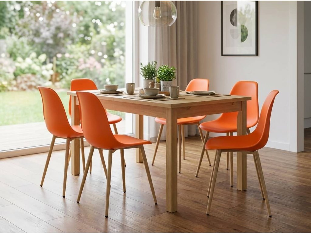 Tradicionalni skandinavski stil koji dolazi iz prirode očarat će vas svojim minimalizmom, neutralnim bojama i lakoćom. Umjereniji stil obogatite jednom izraženom bojom i zelenim biljkama u lanenim visećim loncima. U skandinavskoj blagovaonici oslonite se na čiste linije i jednostavno oblikovan namještaj. Narančasta blagovaonička stolica York Osaka ispunjava sve zahtjeve nordijskog stila. Masivne drvene noge u kombinaciji s crnim ojačanjima savršeno se uklapaju s narančastim sjedištem. Kombinirajte stolice različitih boja oko jednog stola i uživajte u zajedničkom vremenu provedenom s obitelji ili prijateljima tijekom objedovanja.