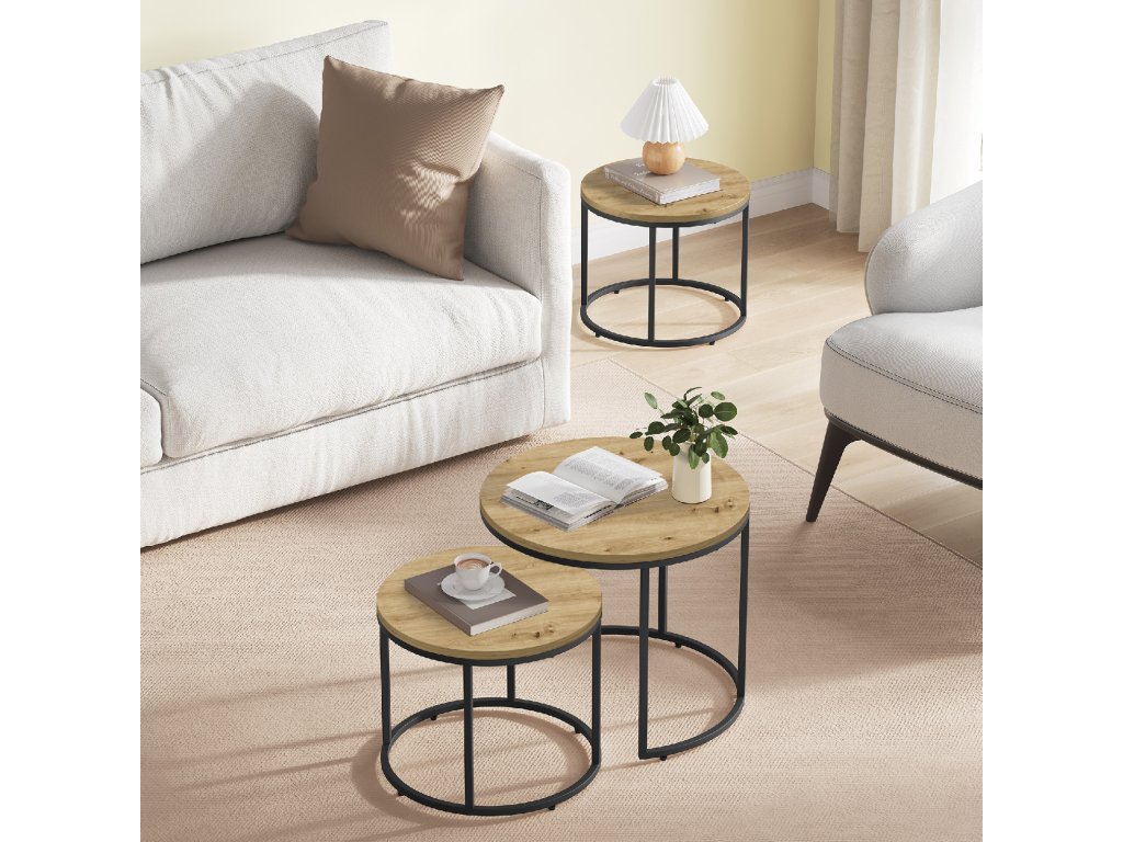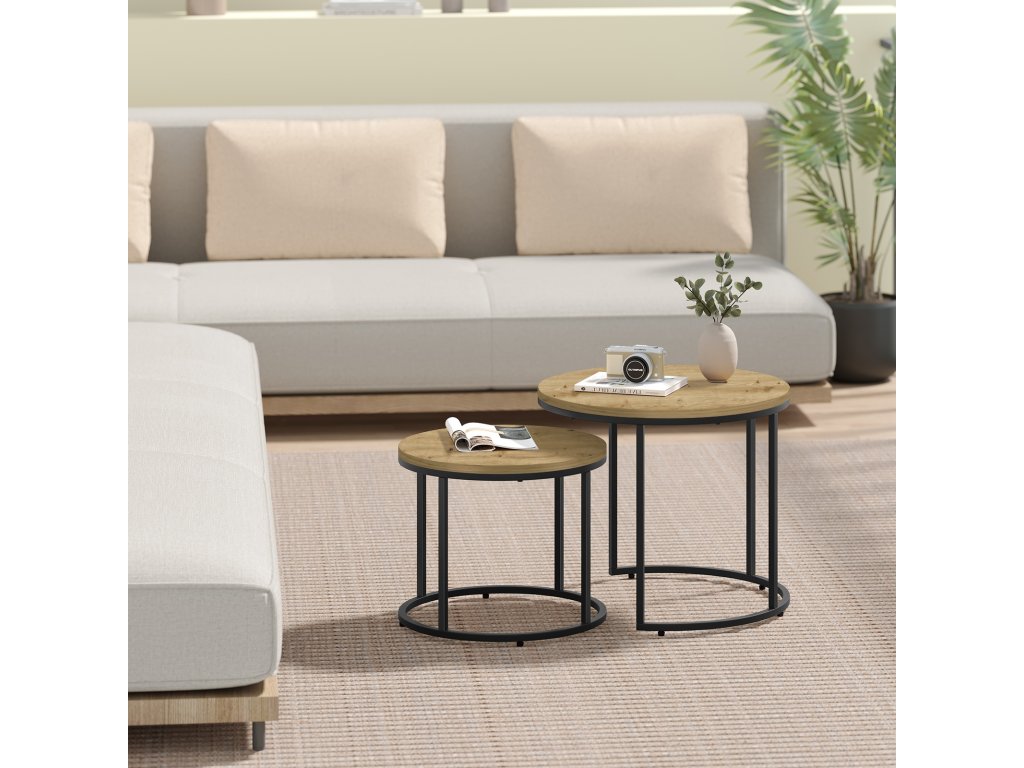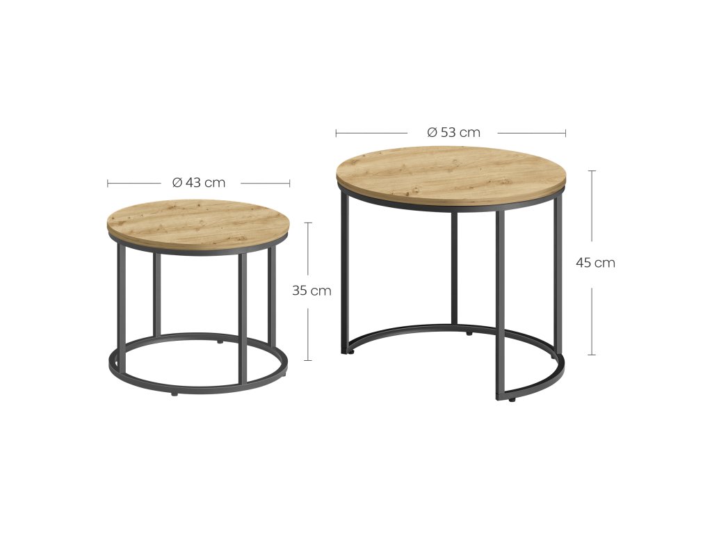 Ovi stolići savršeno odgovaraju kao noćni ormarići u spavaćoj sobi, gdje pružaju dovoljno prostora za lampu, knjige ili budilicu. U dnevnom boravku služe kao stilizirani konferencijski stolići za odlaganje kave, dekoracija ili časopisa. Zahvaljujući svom modernom dizajnu i kompaktnoj veličini, lako se prilagođavaju i manjim prostorima, kao što su balkoni ili terase, gdje stvaraju ugodan kutak za opuštanje. Kombinacija drva i metala daje vašem interijeru elegantan i suvremen izgled.