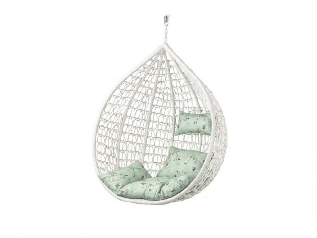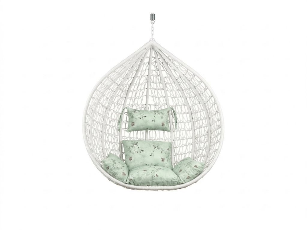 Bijela viseća stolica KOKON bez stalka, svijetlozeleni jastuk s uzorkom