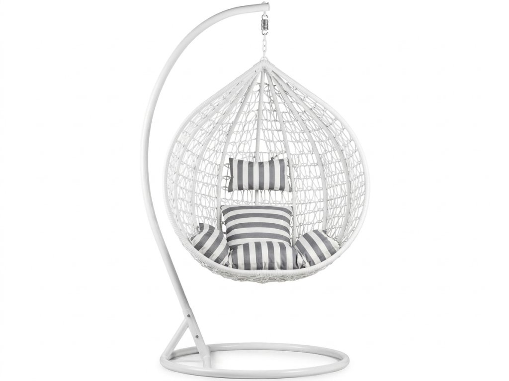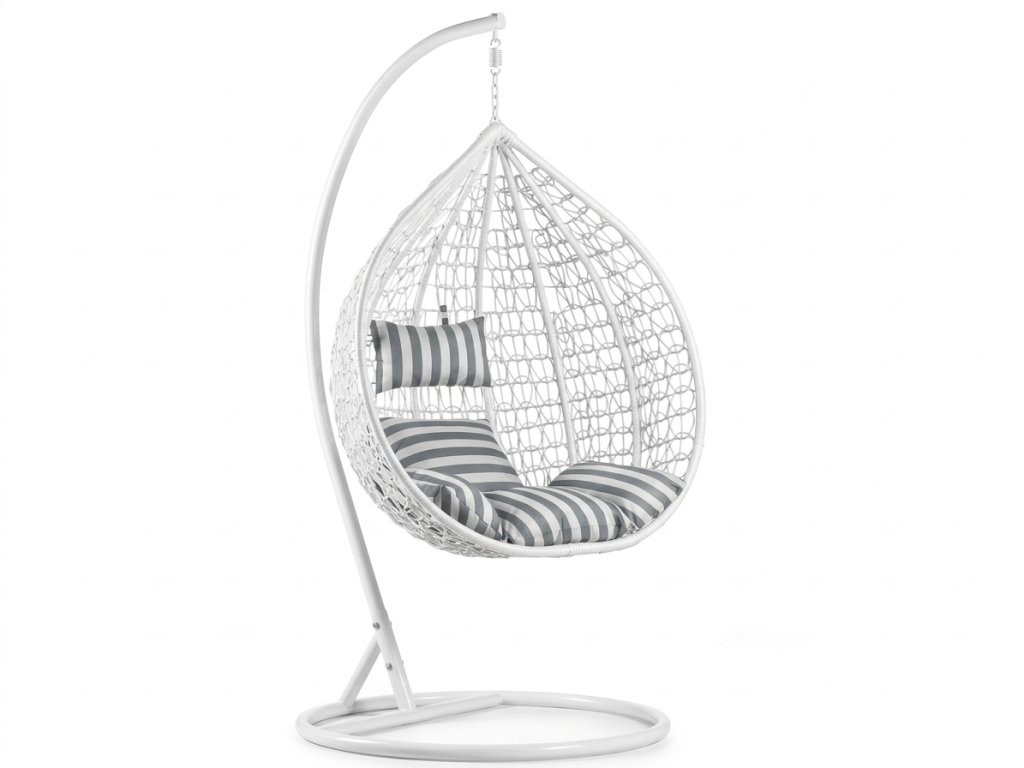 Bijela viseća stolica KOKON sa stalkom, bijelo-sivi jastuk