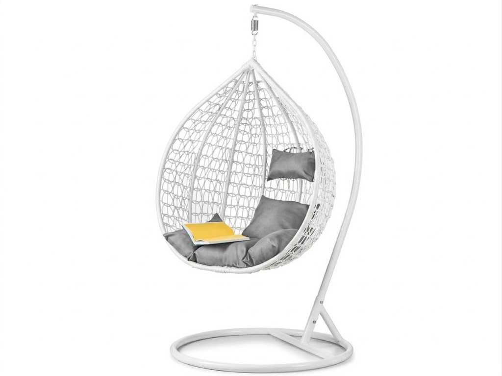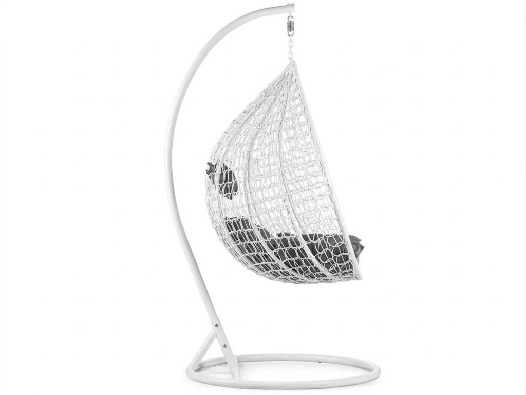 Bijela viseća stolica KOKON sa stalkom, sivi jastuk