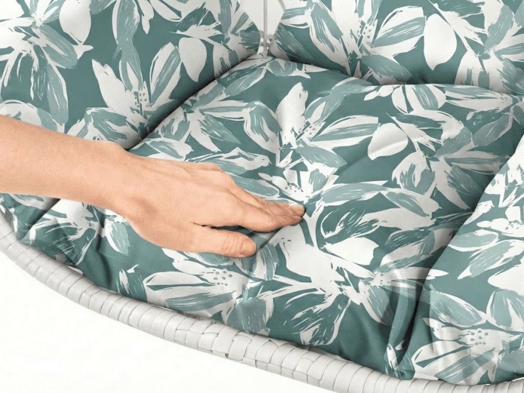 Bijela viseća stolica KOKON sa stalkom, zeleno-bijeli jastuk