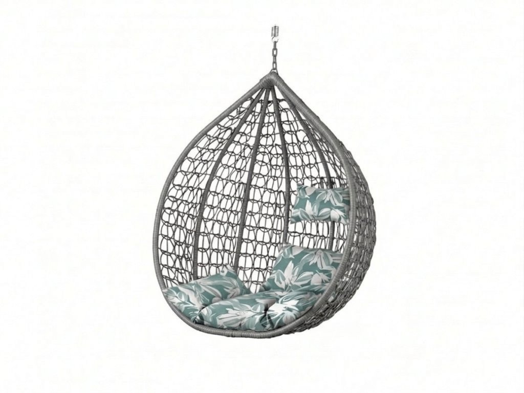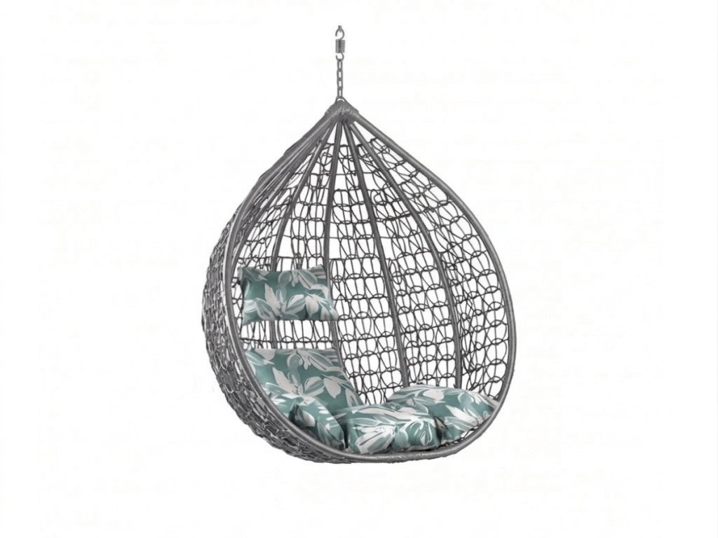 Siva viseća stolica KOKON bez stalka, zeleno-bijeli jastuk