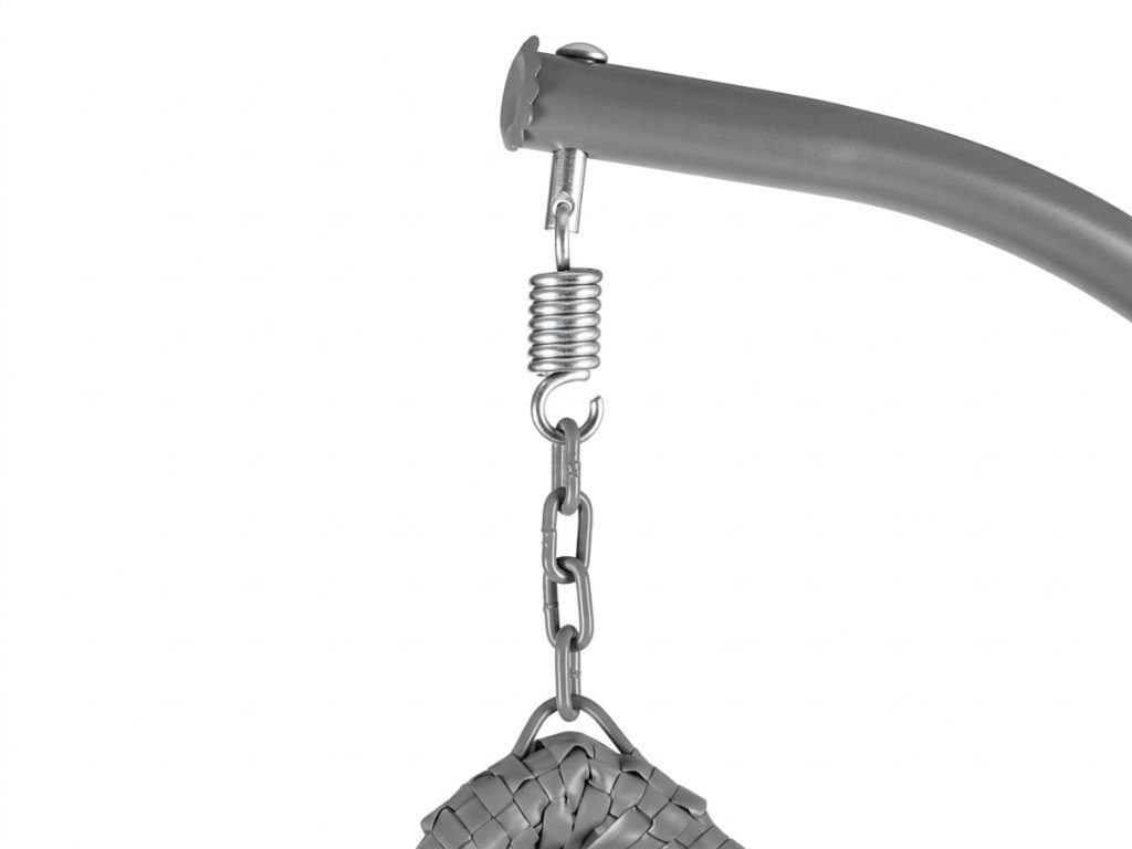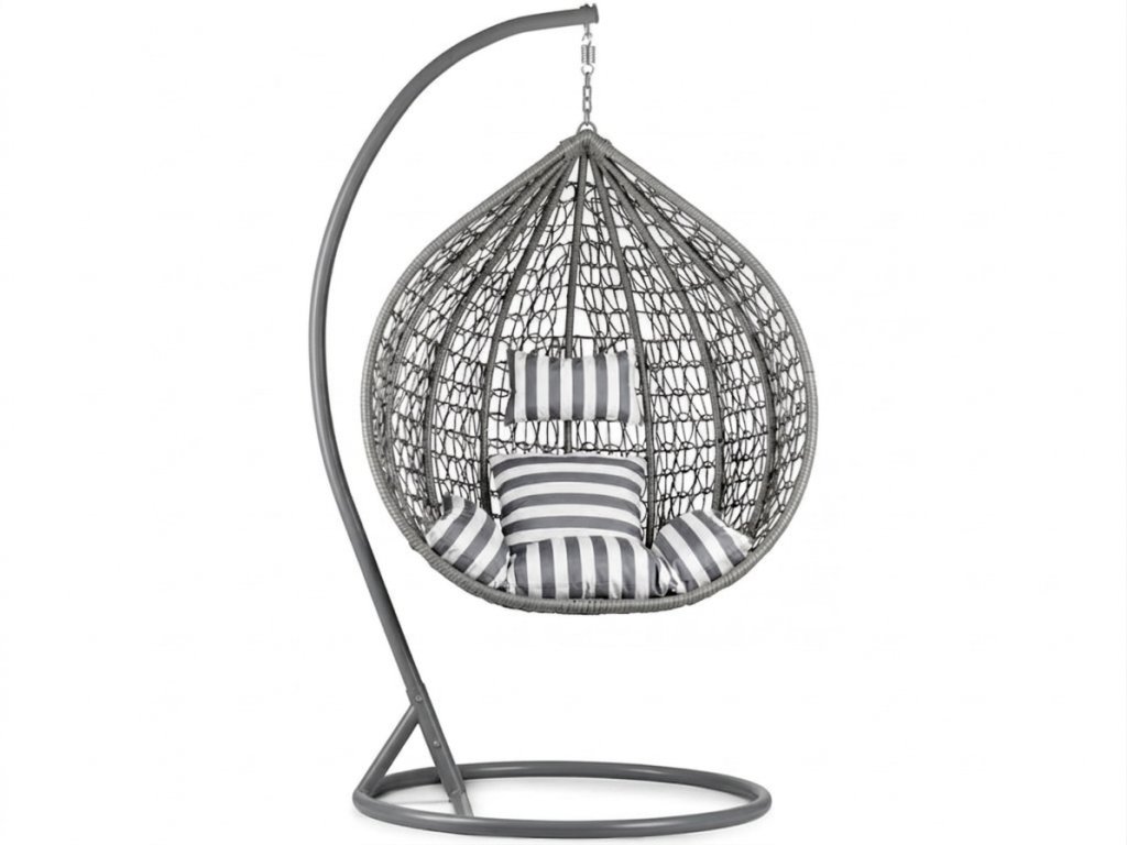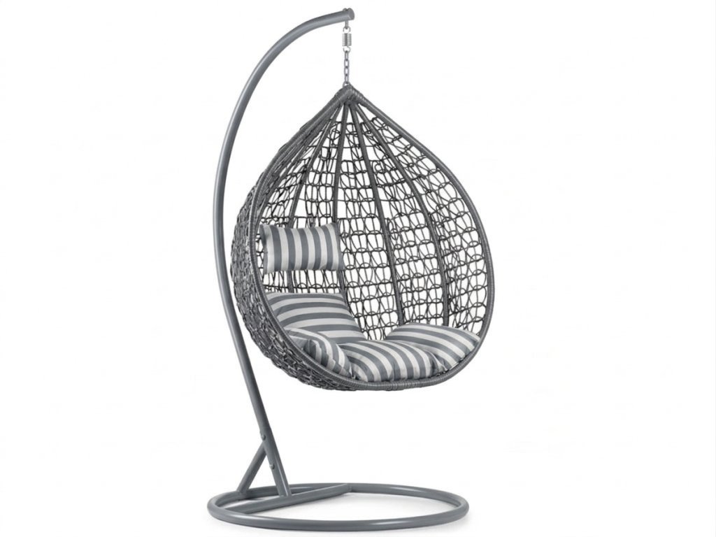 Siva viseća stolica KOKON s postoljem, bijelo-sivi jastuk